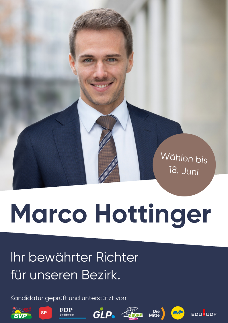 Der Wahlkampf für die Wahl von Marco Hottinger rückt näher. Ich empfehle allen Mitgliedern Marco zu unterstützen. Es genügt nicht, nur seinen Stimmzettel einzulegen. Werdet aktiv, bewegt Eure Verwandten, Bekannten, Nachbarn und Freunde vor dem 18. Juni bei der Wahl zum Bezirksrichter den Namen Marco Hottinger auf den Wahlzettel zu schreiben.