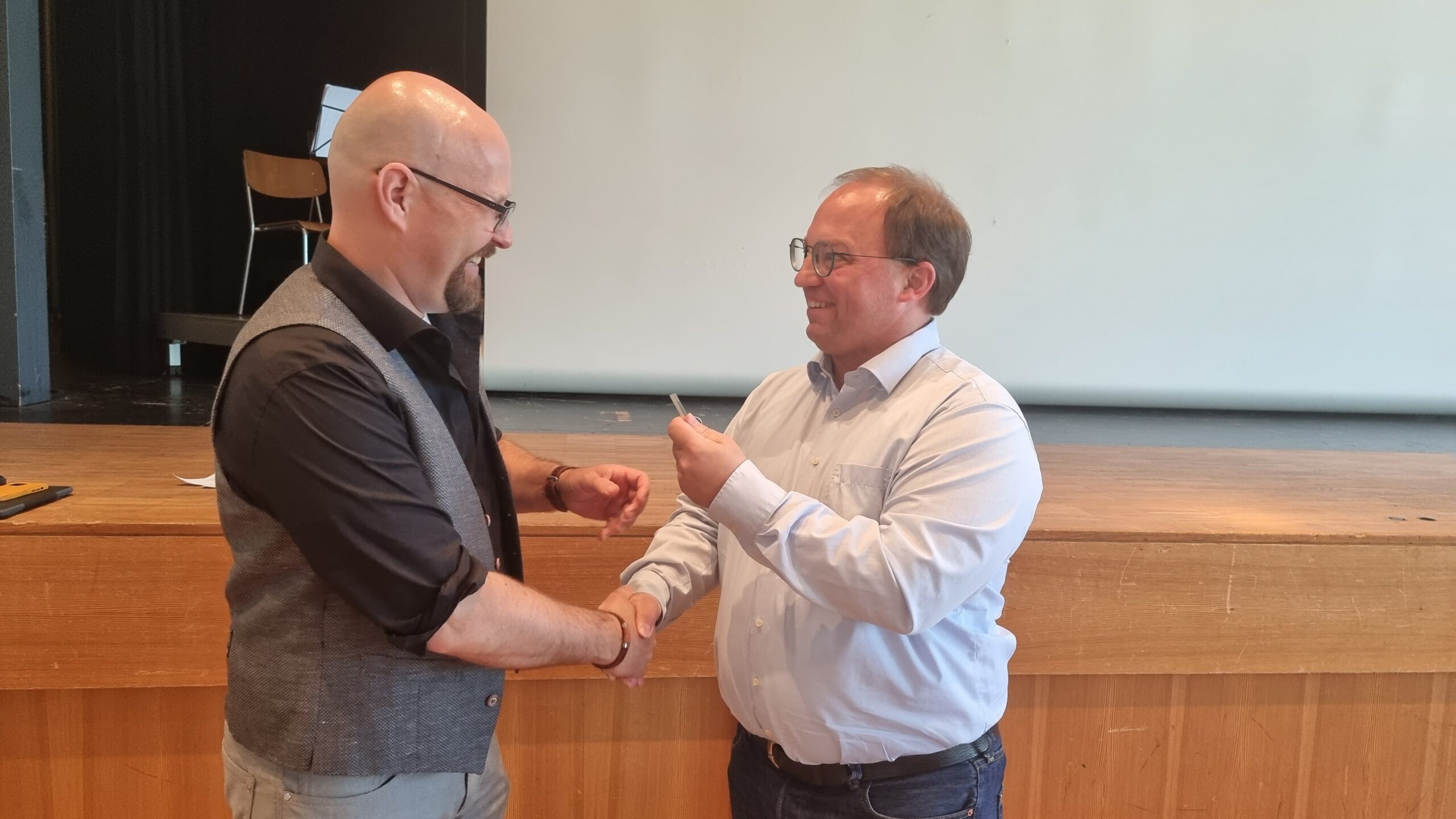 Well done – Matthias Hauser. Christian Pfaller strahlt auch, dass er die wichtigsten Daten digital hat.