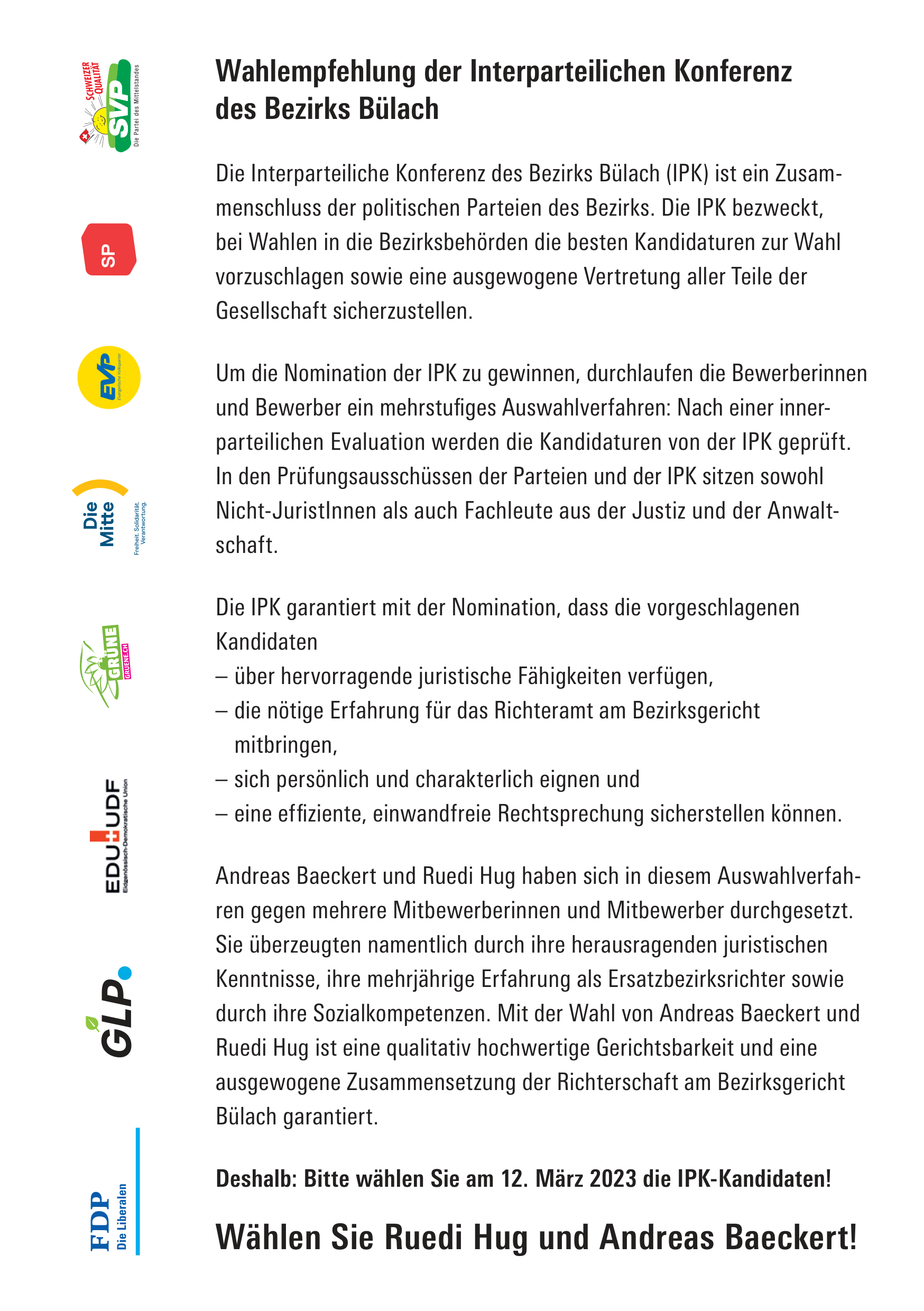Am 12. März 2023 finden im Bezirk Bülach Wahlen für zwei neue Richter statt. Ruedi Hug (GLP) und Andreas Baeckert (FDP) wurden als hervorragende Kandidaten gefunden. Die Interparteiliche Konferenz und die SVP Bezirk Bülach empfehlen daher: Wählen Sie Andreas Baeckert und Ruedi Hug!